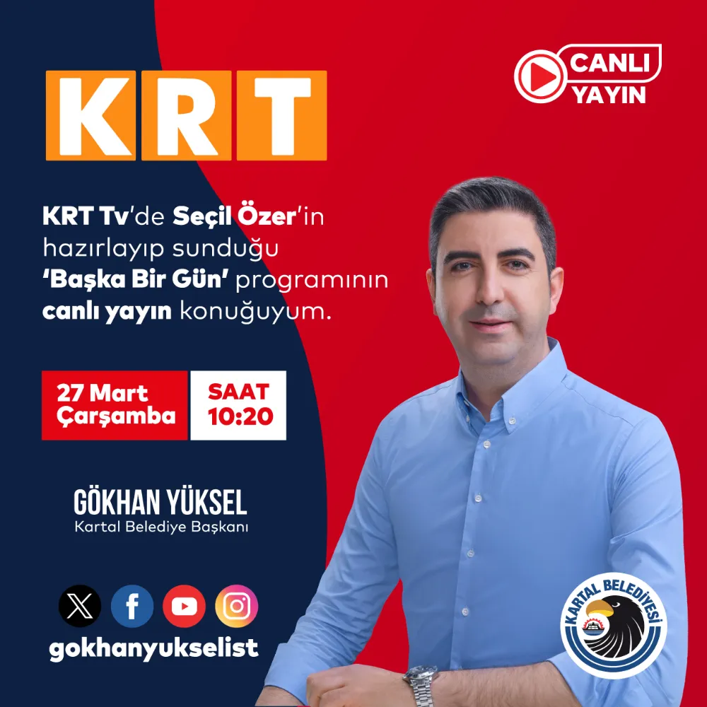 Kartal Belediye Başkanı Gökhan Yüksel, KRT TV’de yayınlanan ve Seçil Özer’in hazırlayıp sunduğu ‘Başka Bir Gün’ programının canlı yayın konuğu olacak. 27 Mart Çarşamba günü (yarın) saat 10.20’de başlayacak olan program, canlı olarak ekranlara gelecek.Kartal Belediye Başkanı, Seçil Özer ile birlikte Kartal’da hayata geçen ve yeni dönemde gerçekleştirmeyi planladıkları proje ve hizmetler hakkında konuşarak Özer’in gündeme ilişkin sorularını yanıtlayacak.