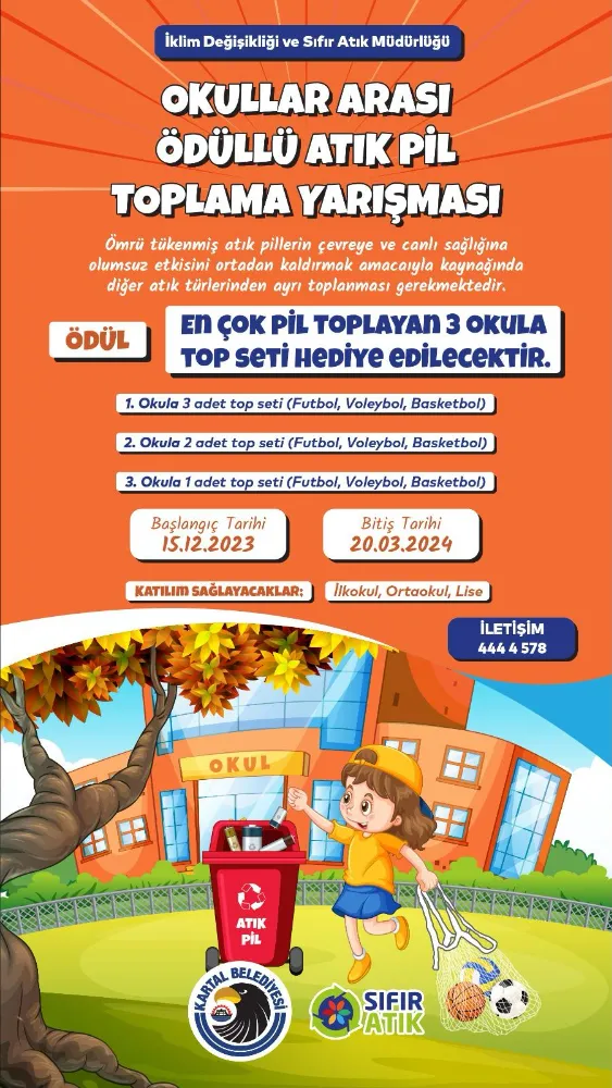 Kartal'daki ilkokul, ortaokul ve liseler, Kartal Belediyesi'nin düzenlediği 'Okullar arası Ödüllü Atık Pil Toplama Yarışması'na katılarak temiz bir çevre için yarışacak.