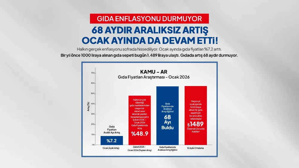 Gıda fiyatları 2026 yılına çok hızlı bir artış trendiyle girdi. Kamu çalışanlarının ücretlerine yıl başında yapılan zammın neredeyse yüzde 40’ı, emeklilere yapılan zammın da yarısından fazlası daha ilk ayda gıda fiyatları karşısında eridi. Ocakta bir önceki aya göre yüzde 7,2 oranında artan gıda fiyatlarında, geçen yılın ocak ayına göre artış ise yüzde 48,9 olarak gerçekleşti. Gıda fiyatlarındaki aralıksız artış süresi de ocak ayıyla birlikte 68 aya çıktı. Ocak 2025’te 1.000 liraya satın alınabilen bir gıda sepeti için vatandaşlar Ocak 2026’da yılında ortalama 1.489 lira ödemek zorunda kaldılar.