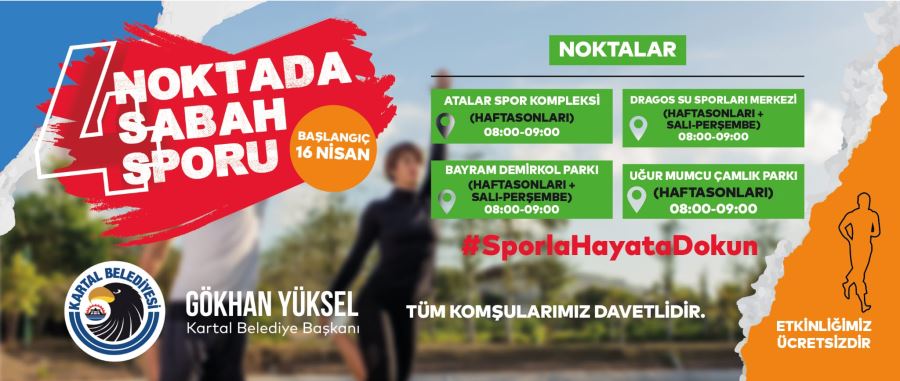 16 Nisan Cumartesi günü başlayacak olan sabah sporu; Atalar Spor Kompleksi, Dragos Su Sporları Merkezi, Yakacık Bayram Demirkol Parkı ve Uğur Mumcu Çamlık Parkı’nda 08.00-09.00 saatleri arasında yapılacak.
